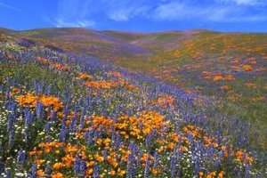 ion from which we were speeding along, the flowers looked all the same height. And there was nowhere to stop and take my own photo! I’ve looked online for pictures and they are all taken in the hills closer to the pass, but this one shows the species of flowers we were probably seeing, California poppies and a kind of lupine.