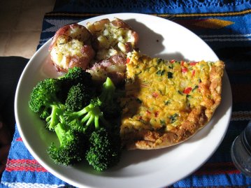 If, in addition to your veggie-laden egg pancake, you serve a steamed vegetable on the side and a tossed green salad, you might almost make up for the rest of the day when we tend to have so few vegetables. And as my husband is always reminding me: Though “experts” may debate about what is the healthiest diet, high-carb, low-carb, low-fat, low-sugar, etc., everyone but everyone agrees that we should all eat our vegetables.