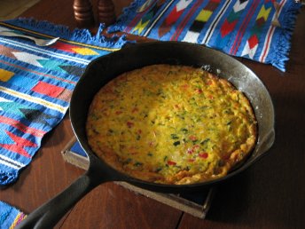 Today is Cinco de Mayo, so even though I’ve already published two posts today, I’ll try to get this one out there and be timely for once. I forgot about the holiday for most of the day; our family hasn’t usually celebrated it though the festivities are all around us here in California. It was pure happenstance that I decided that the frittata I was planning for dinner would be made with Tex-Mex flavors. Then after it was in the oven someone mentioned the holiday, and I was very pleased with my unconscious “choice.” When I saw how lovely the pie looked, I whipped out my placemats that might actually look more South American than Mexican…but in any case, they looked more fitting than the everyday ones.
