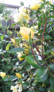 Here is a close-up of the Golden Showers, a rose I bought with a Jackson & Perkins gift certificate that my fellow-gardener sister K. so thoughtfully gave me for my birthday one year. Now it always makes me think of her.