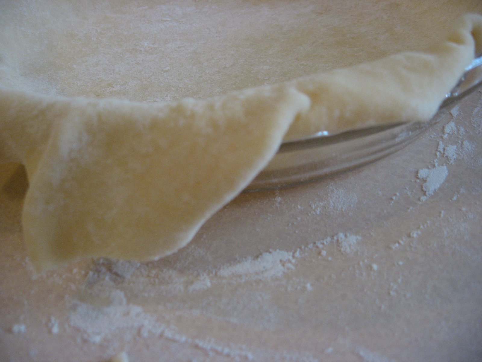 With the empty pie plate nearby, I roll the dough part way back on to the rolling pin and then lay it back gently on to the pie pan, draping it over the edges and making sure that it is snug but relaxed into the corners of the bottom.