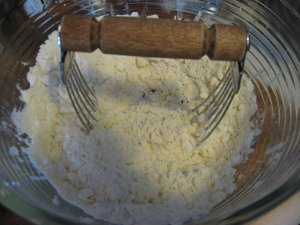 The flour, sugar, salt and butter are being coarsely blended together with my favorite pastry blender. The recipe for this pie dough is here.