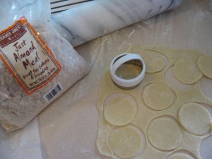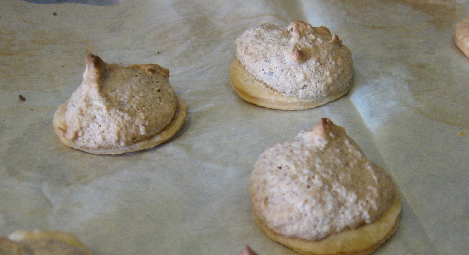 I folded some almond meal and cinnamon into the meringue and put little dollops of that on the rounds of dough, and baked them. They were cooked at various temperatures, kind of “on the back burner” because I didn’t have time for them, really. And after I assembled them I thought, Oh, dear, meringue-type cookies want a slow oven, and pie crust cookies a fast oven. So these will be terrible.