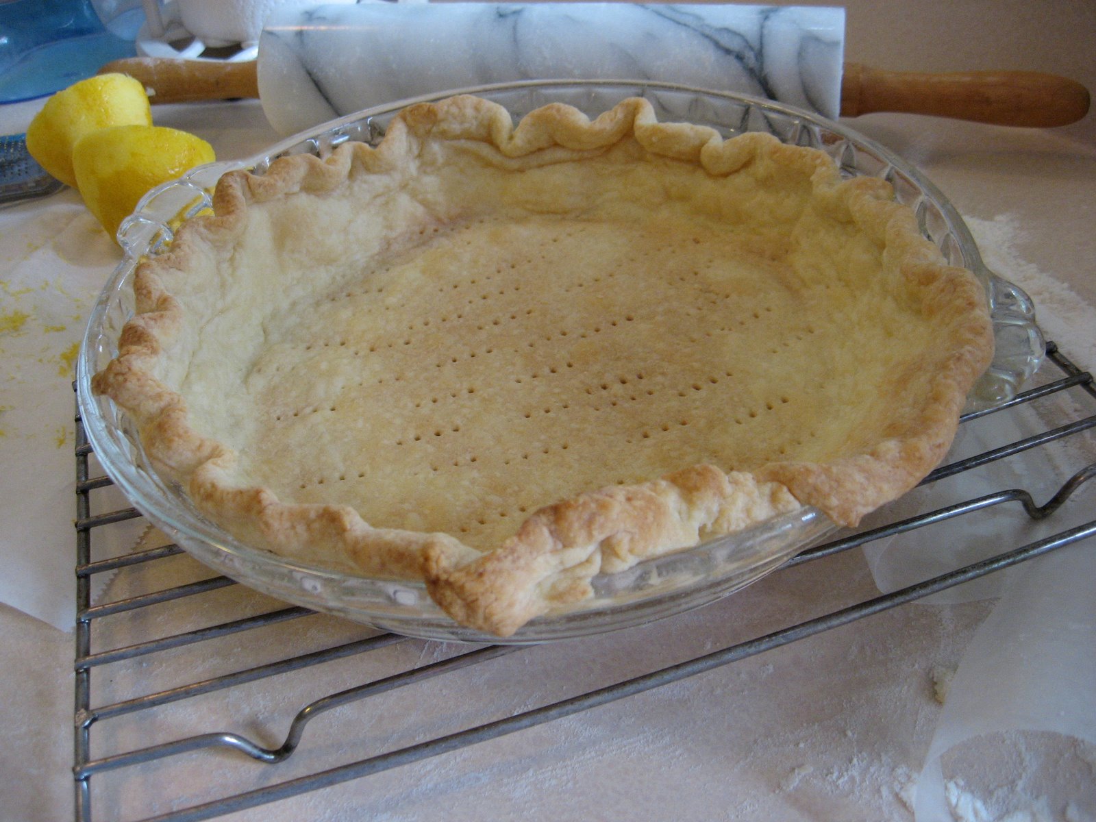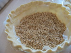 The pie shell was ready to bake at this point, and after pricking it with a fork, I laid some rice on to wax paper in the bottom of the shell, to keep it from puffing up while baking. In the past I have used beans or another, smaller pie plate.