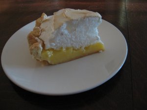 This picture shows how 1) the filling did in fact get pushed out of shape when I swirled all that meringue around, 2) the meringue topping is way out of proportion to the filling, which should be the main event, and 3) the crust soaked up a lot of moisture from the filling. Is that supposed to happen? Won’t it naturally go through the holes pricked in the dough? The crust was very good nonetheless, not soggy at all, but the pie was sitting in a pool of lemony liquid. So maybe that is the runnyness that people talk about trying to avoid.