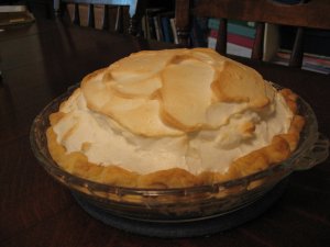 Now I’ll show you a less becoming photo of the finished pie. The meringue looks great, but there are handles….They might be useful if you were trying to eat a slice of pie out-of-hand. I hope you don’t do that!