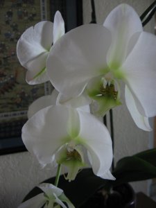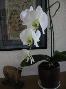I bought this orchid in bloom at Costco a year and a half ago, to beautify the house for Christmas. Normally I don’t have houseplants, but this was a lovely thing, and I decided to give it a try. It hung like angels over the crèche for a while, and after I put away Christmas it kept blooming. I don’t know when it stopped, but I cut the stem down and fed and watered it less than I was told to.