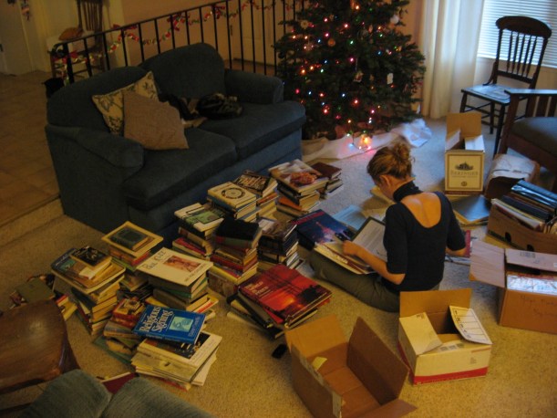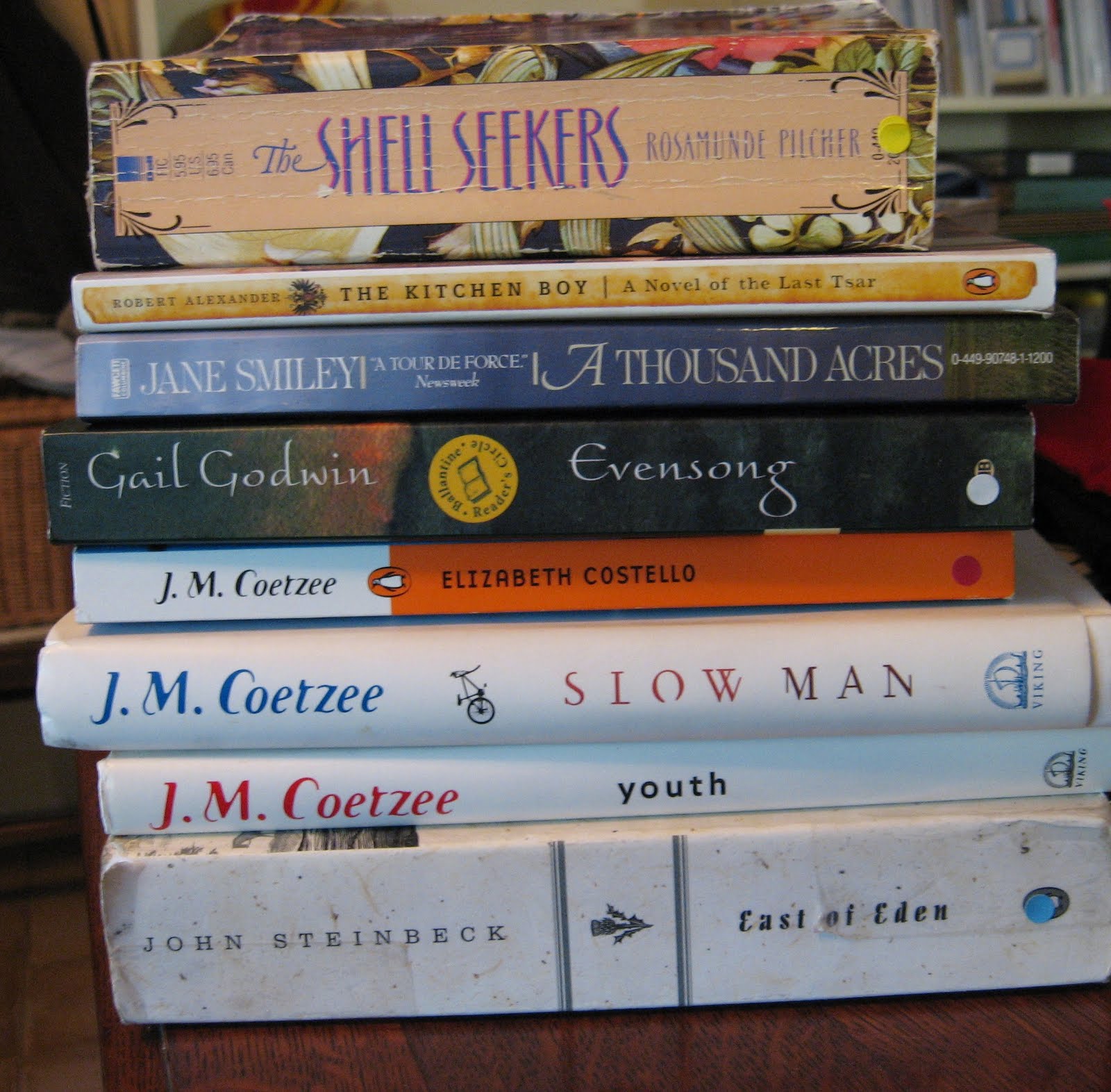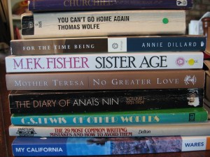 One of my blogger friends posted a picture of her book piles today. I realized that I love this sort of picture because it is a quick version of a browse over more extensive book shelves. It reminded me that I have similar piles around here. This first pile is the books I gave up on this summer, and will be shipping out. I’m still trying to find time to write about why I didn’t finish them. Several of them are by writers I know are good, but I am not equal to them, or I don’t have time for them, or something.
