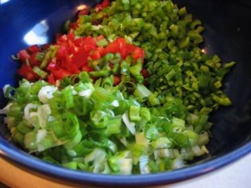 Enough of that wimpiness–This time I took the plunge and bought Anaheims (in the picture above, next to the cilantro), which I am familiar with because we grew them in the past, and Serranos. The Serranos (dark green, at the bottom of the photo) were the experimental ones; I’ve never used them, but they don’t carry the most fiery connotation to my mind.
