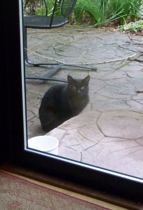 I think my favorite cat lately is the black one below, because after watching me watch him emptying the bowl, he sat down to just be near me for a spell.