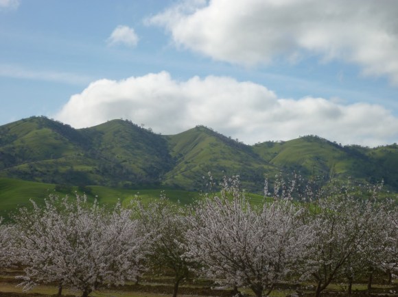 I emerged from the forest into the broad Central Valley of California, to the lovely display of barely pink almond blossoms. These are younger trees than the ones I photographed last month, but in the same neighborhood.