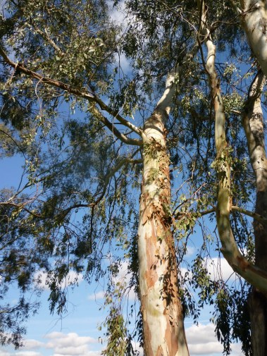 I had to find a likely exit, where there would be a nice view, and a place to park. The first public rest area had a tall chain link fence all around it and not a very good look at the sky, but even the scraggly eucalyptus seemed lovely to me that day.