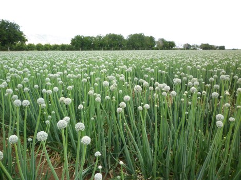 While still on the flats I saw acres of alliums under a sky as white as their flowers, with drops of rain starting to fall out of it. They are onions, yes?