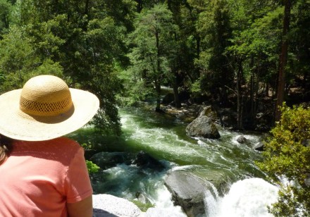 All the waterfalls are exciting this rainy year of 2010. Mr. Glad and I hiked together part way to Vernal Falls, and I read a book while he completed the ascent to the top of the falls. High steps are cut out of the rock next to the canyon, where spray from the waterfall drenches the hikers on the Mist Trail, some on their way back from the summit of Half Dome.