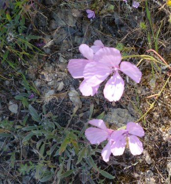 Being there in June meant that we got to see a different batch of wildflowers from those in July. All along the Merced Canyon coming in from Mariposa, the hills and roadsides were covered with these flowers that I am pretty sure are Farewell to Spring, otherwise known as Dudley’s Clarkia, a type of clarkia that reportedly only grows in California. Clarkia is named after William Clark of the Lewis and Clark Expedition, and I wasn’t surprised to learn that it is in the evening primrose family. It reminds me of the Mexican Evening Primrose by my driveway at home.