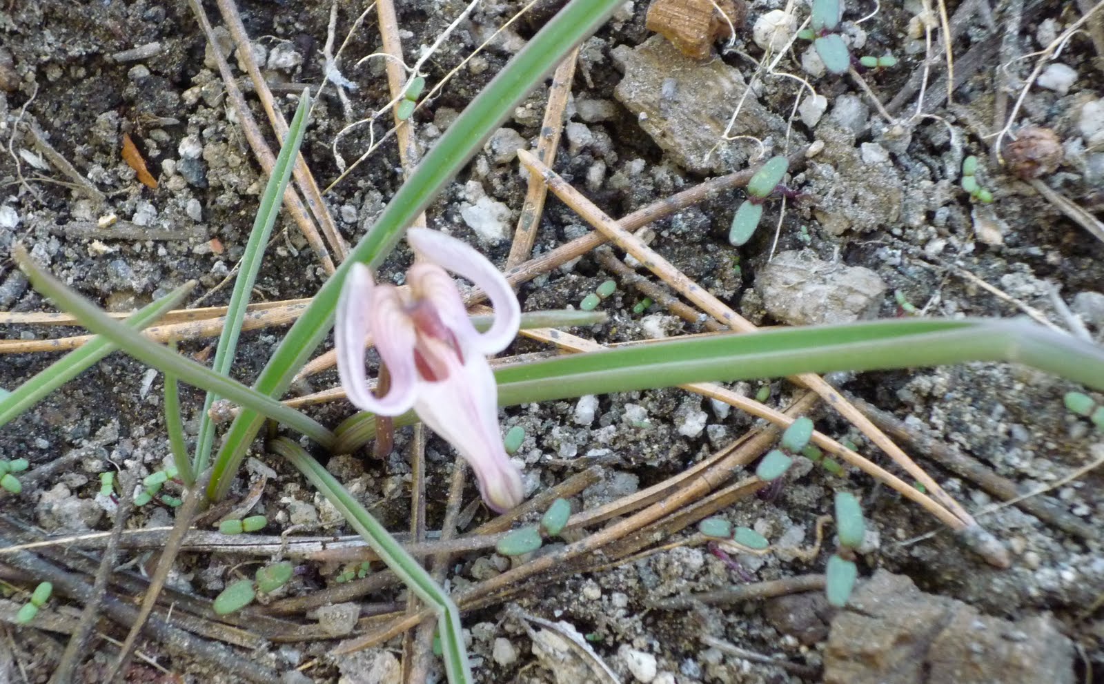 The curious specimen here, for example, has the look of a Longhorn Steershead–the descriptive common name of a flower, Dicentra uniflora–but it doesn’t have the leaves to match that identity, which would be a relation of Bleeding Heart. Is it an imposter steer? How could there be two flowers so similar, that are not at least in the same family? Those blade-like leaves must go to something else…but where are steershead’s leaves? Very odd.