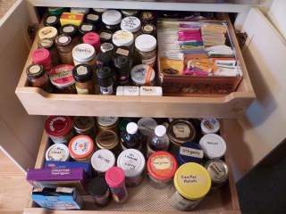 The upper tray is shallower so I put the shorter containers there, alongside my box of teabags that I bring out for guests to choose from. On both trays I tried to have the spices on the left and the herbs on the right, but I wasn’t very strict about it. Since I don’t make gallons of soup every week anymore, the large containers of seasonings aren’t necessary, and I will convert to smaller ones gradually as I use them up. It was buying these ingredients in one-pound packages through our food co-op that led to keeping generous quantities. Two or three times kind friends have given me collections of spices as gifts, which only encourages happy expansion.