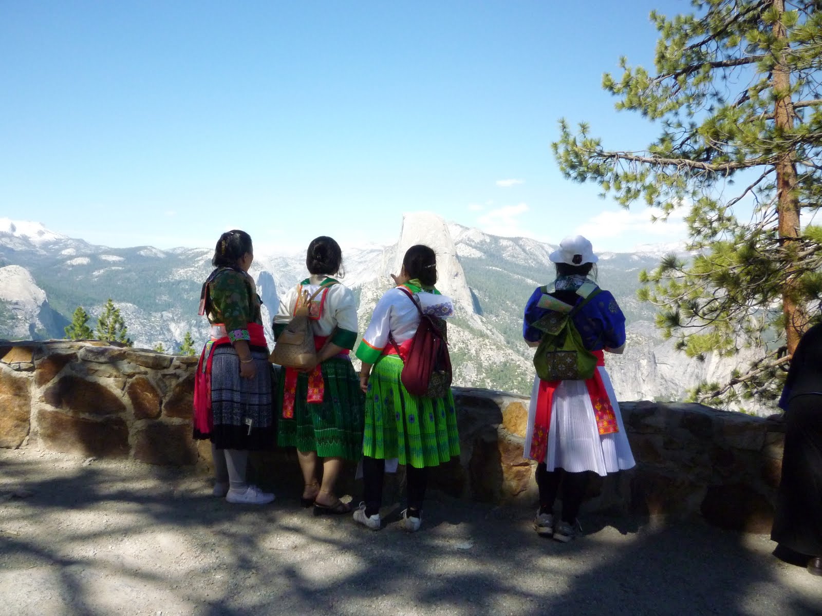 At Glacier Point the people-watching is unbeatable, because the population is international (Yosemite belongs to the world, or the U.N., or something, after all, which doesn’t please anyone I know), and there are so many people. After driving up the mountain all that way they aren’t in any hurry to leave, so everyone can watch everyone else as well as the scenery. We wondered if this pink-and-black woman might be on her honeymoon…anyone have a guess as to the origin of what looks like a traditional costume?