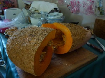 Behold, a squash plant sprouted and spread its vines vast and wide, bearing several giant fruits, which we agreed look like a cross between a Hubbard and a Butternut. For the meal they cooked part of one, and then split another open to send pieces home with several of us. I started this blog post mostly to tell about the amazing squash, but I got carried away as is common.