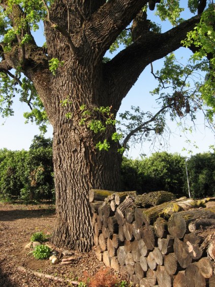 Always Daddy had stacks of firewood under the canopy of branches, usually fruit wood that he’d gleaned from neighboring orchards that were being replaced. But here we see it is logs cut from our tree’s own pruned limbs.