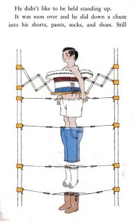 I like this picture, only because it shows that even Tommy is capable of struggling. Maybe we could think of him as a late bloomer, crawling when he should have learned to walk — but at least he is showing some spunk. At the end of the book he experiences enough discomfort resulting from an electrical outage and the failure of technology that he resolves to “turn over a new leaf.”