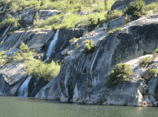On one side of the bowl a wall of granite rises up, not too sheer, with plenty of ledges and crevices from which to high-jump into the deep waters. Mr. Glad was the only one of us who swam, but we ladies waded for quite a while and wiggled our toes in the fine granite gravel.
