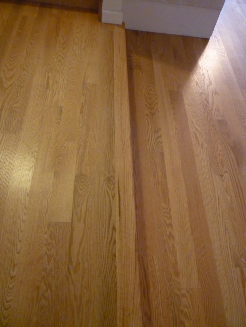 The entry area is raised 6 inches above the rooms on either side, but formerly a metal strip provided a visual cue for most people. Now even friends who have been in our house many times before have missed the step and abruptly stumbled off.