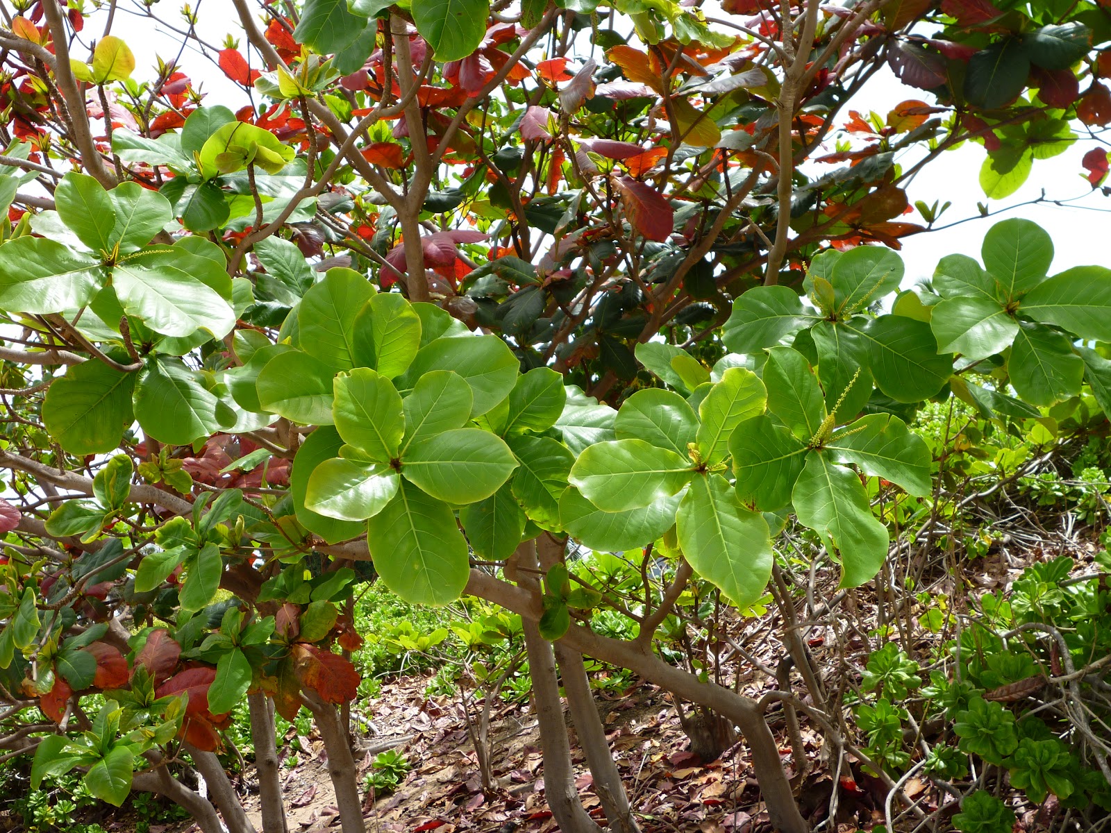 I wish I had taken a dozen more pictures of plumeria trees. Many of the taller ones look at first glance as though they are some kind of dead thing, but then you notice the flowers at the tip of every smooth and bare branch.