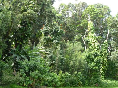 The writer of the plant guide we took to Maui was clearly biased against species that were not native, or that at least had been brought from other Polynesian islands long ago, but I admit to liking many of those plants very much. The African Tulip Tree makes lovely splashes of orange against the green landscape, and it at least doesn’t seem to have spread into the weed category yet.