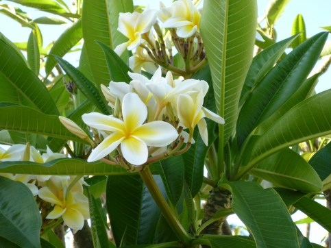 Plumeria! I’m in love with plumeria. I knew of leis, of course, and I’d heard that flower mentioned, but I had to go to Hawaii to see what a plumeria blossom looks like or get intoxicated by its scent. It was a surprise to find that these sweet flowers grow on trees.