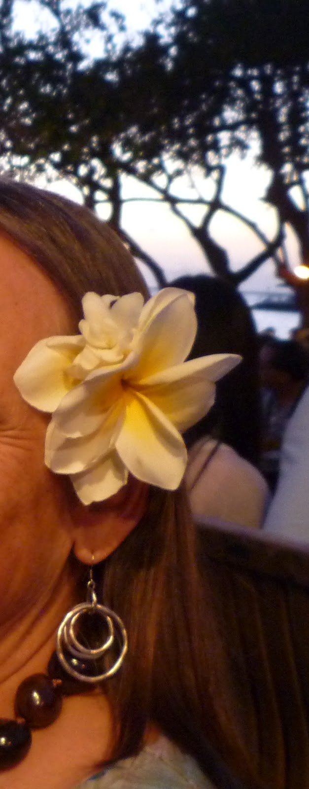 We went to a luau where a girl in Hawaiian dress taught female guests how to stick plumeria flowers on to a toothpick to make a rosette, which she then fastened into our hair with a bobby pin.