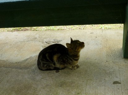 On the drive to Hana we ate our lunch at a wayside park where a green lawn ran up the hill to a tall and thick forest — or perhaps on that rainy stretch it would be called a jungle. I spotted chickens with shiny feathers up there, and walked up to try getting a picture. It was not to be: the closest bird disappeared behind some vines, I followed as quietly as I could and peeked under the trees, to see a couple of cats lounging there with the chickens. It was just a glimpse, and then the whole inter-species family was gone from sight.