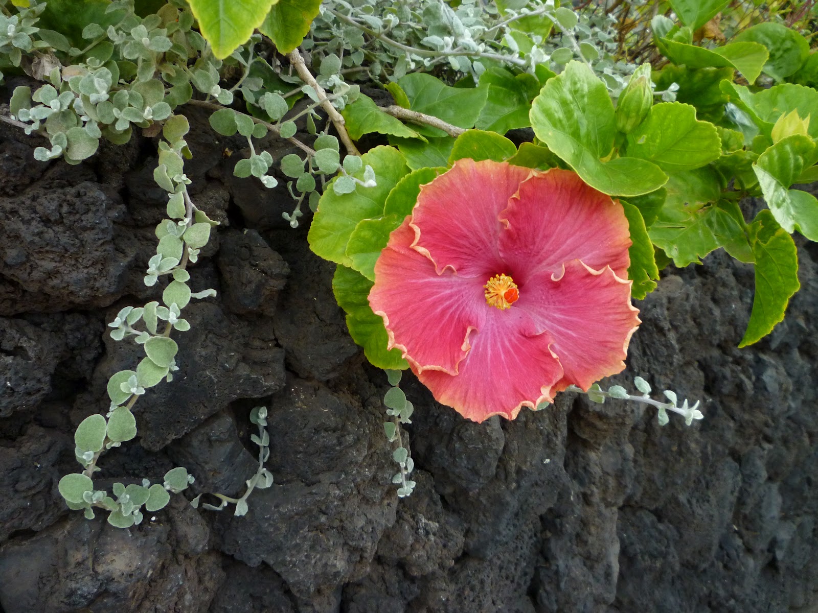 | Hibiscus looks nice against volcanic rock. |