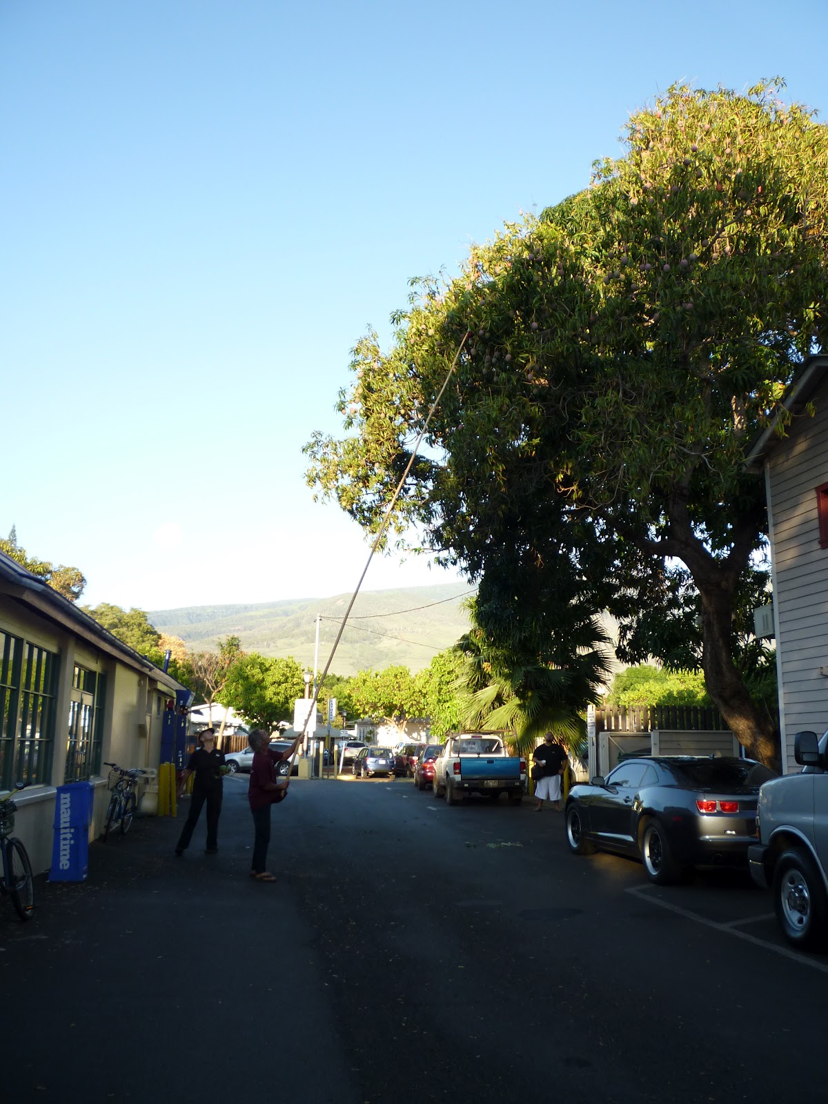 It seems that a lot of trees bearing flowers or fruits are so tall that it takes some trouble to harvest the crop. I asked the rosette-pinning woman (whom I tell about further down) if pickers use ladders to get the flowers from those tall plumeria trees, and she replied that they “mostly climb” to fetch them. Walking around Lahaina, we saw a man picking mangoes with a long pole contraption, and it’s certain one would need a ladder or good tree-climbing skills to get papayas.
