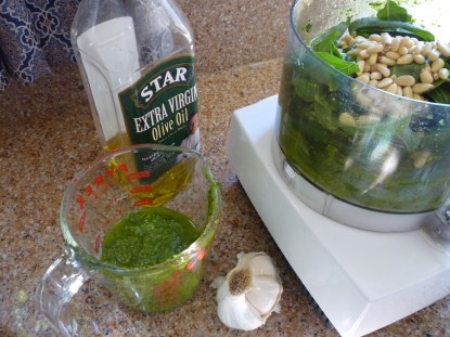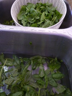 Not me. I have mostly been whining about everything, including the reality of all the work undone and how I hate leaving home. I was standing at the sink this afternoon whimpering as I pulled leaves off stems, when it hit me that making pesto is one of my most favorite things to do. How wonderful is it that I have a garden that grows basil, from which a woman can create one of the wonders of the culinary world?
