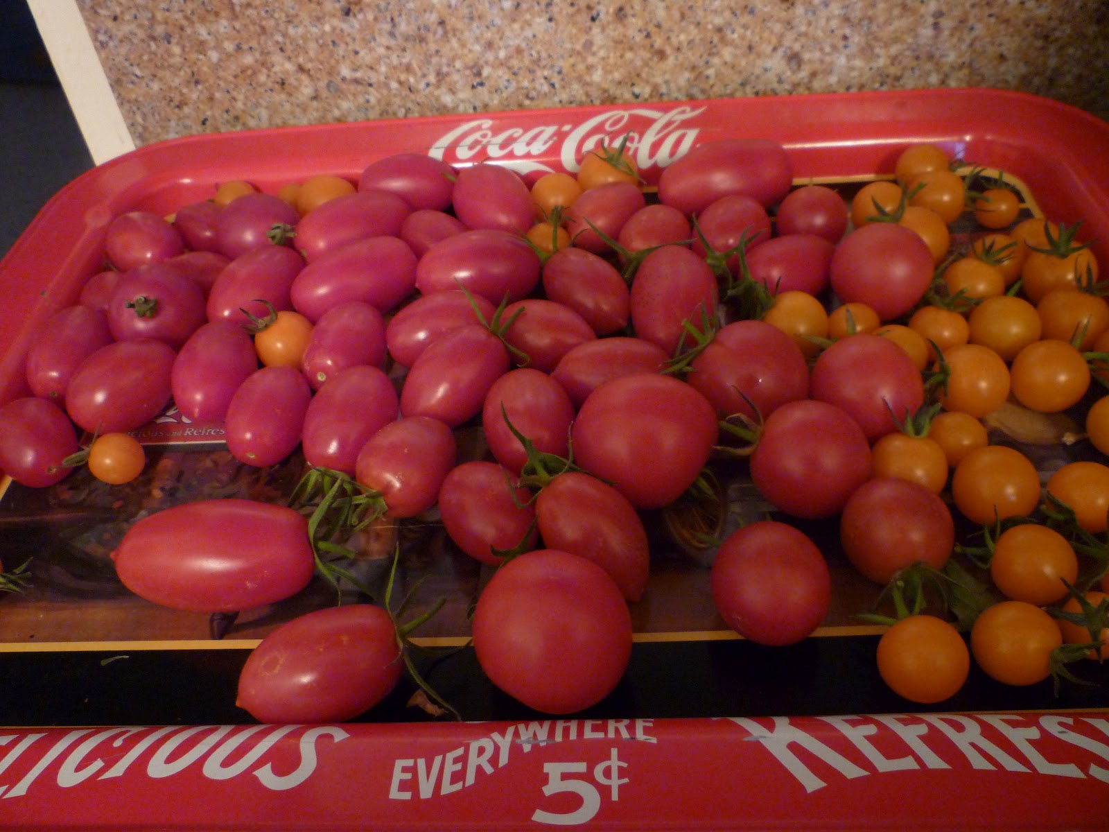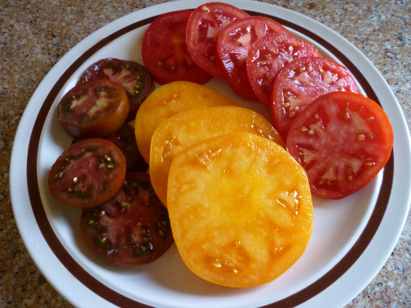 Oh, I didn't comment on your fabulous tomatoes! I do wish I could sit down and eat a dish of them with you. They look delectable. My 2 tomato plants in pots have done terribly. The larger Brandywine, which I was so hopeful for, has suffered from the potting, or from too much rain(?), and the the cherry tom plant hasn't ripened fully yet. Waiting…