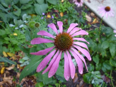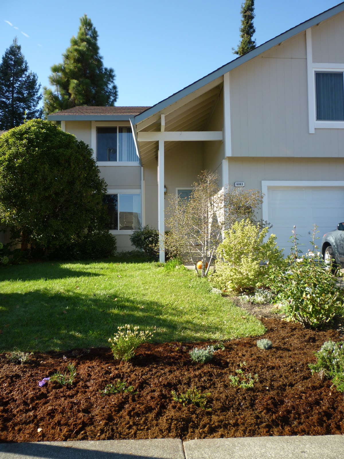 This pic shows where the patch of lawn was replaced with some little shrubs and perennials that don’t need much water. They are small now but will spread out before long. Parts of the front yard still need sprucing up for winter, but I wanted to take this picture before the flowers faded from the new plants.