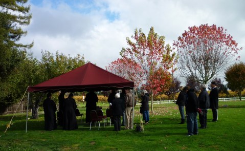 Not long into the service three words, “quickly flowing life,” pressed on my mind, referring to our earthly existence. It seemed the perfect time of year for this opportunity to turn our minds to death and corruption; I could see the vineyard across the street all in gold, and apples had fallen from trees all around the awning that had been set up for us.