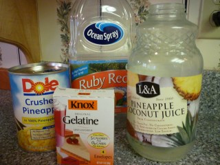 peeled fresh orange sections or a large can crushed pineapplePut about 6 cups of the Ruby Red in a pot and whisk in the gelatin. Heat these together until the gelatin is dissolved. Add and dissolve the sugar, remove from heat and add the remainder of the Ruby Red along with the pineapple-coconut juice.