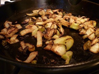 I started by chopping and sauteeing the vegetable. Already I can’t remember if I used olive oil or butter, but some people liked to use a combination. I was looking for a caramelized or roasted effect, and I didn’t want to heat up the oven for such a small amount, so I used a cast-iron skillet. I sprinkled on salt and pepper and cooked the fennel slowly. Some of the pieces were too large to actually caramelize, but there was enough sweet roasty flavor coming from the licorice-flavored bulbs to make for a great taste in the resulting soup.