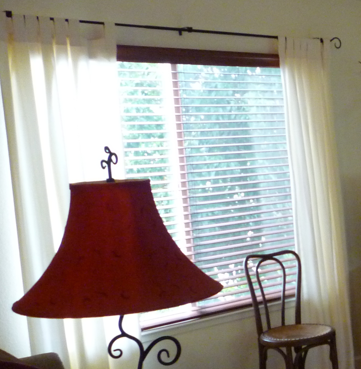 About 30 years ago we owned a modular house whose many large windows were covered by the original fancy draperies, so that when the curtains were closed they covered most of the expanse of three walls with nubby gold curves. The walls were thin particle board painted to look like wood, as you can see in the photo – but I didn’t mind those as much as the drapes. I would have preferred something more rustic and casual and of another color to go with the country setting, but even if we’d had the money we couldn’t have justified spending it to replace Perfectly Good high-quality drapes.