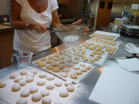 Kourabiedes are reminiscent of Russian Tea Cakes or Louisiana Pecan Balls, only softer. Our recipe uses ground almonds, and we stick a clove in the top of each rolled ball of dough before baking. I see variations in recipes online that use walnuts, roll the dough into different shapes, and leave out cloves altogether. I tasted a cookie and found that the clove does indeed become crumbly during the long baking and is easy to chew. It spices up the cookie very nicely.