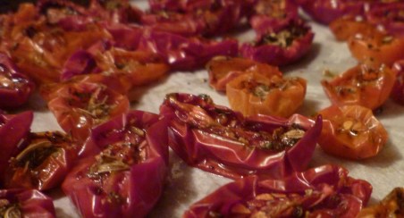 When the tomatoes came out of the oven – they were mostly Juliets and SunGolds – I packed them into the freezer to use for appetizers or garnishes. All that work was yesterday; after crashing and sleeping I woke with enough energy to tell all about it.