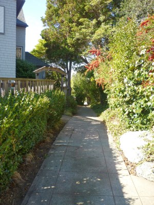One of the houses we were searching for was only a few blocks from here, so we walked up the street, admiring the many flowers still in bloom in this mild climate. Banks of fuchsias always remind us of the long row of them that grew along the brick path in Grandma and Grandpa’s back yard.