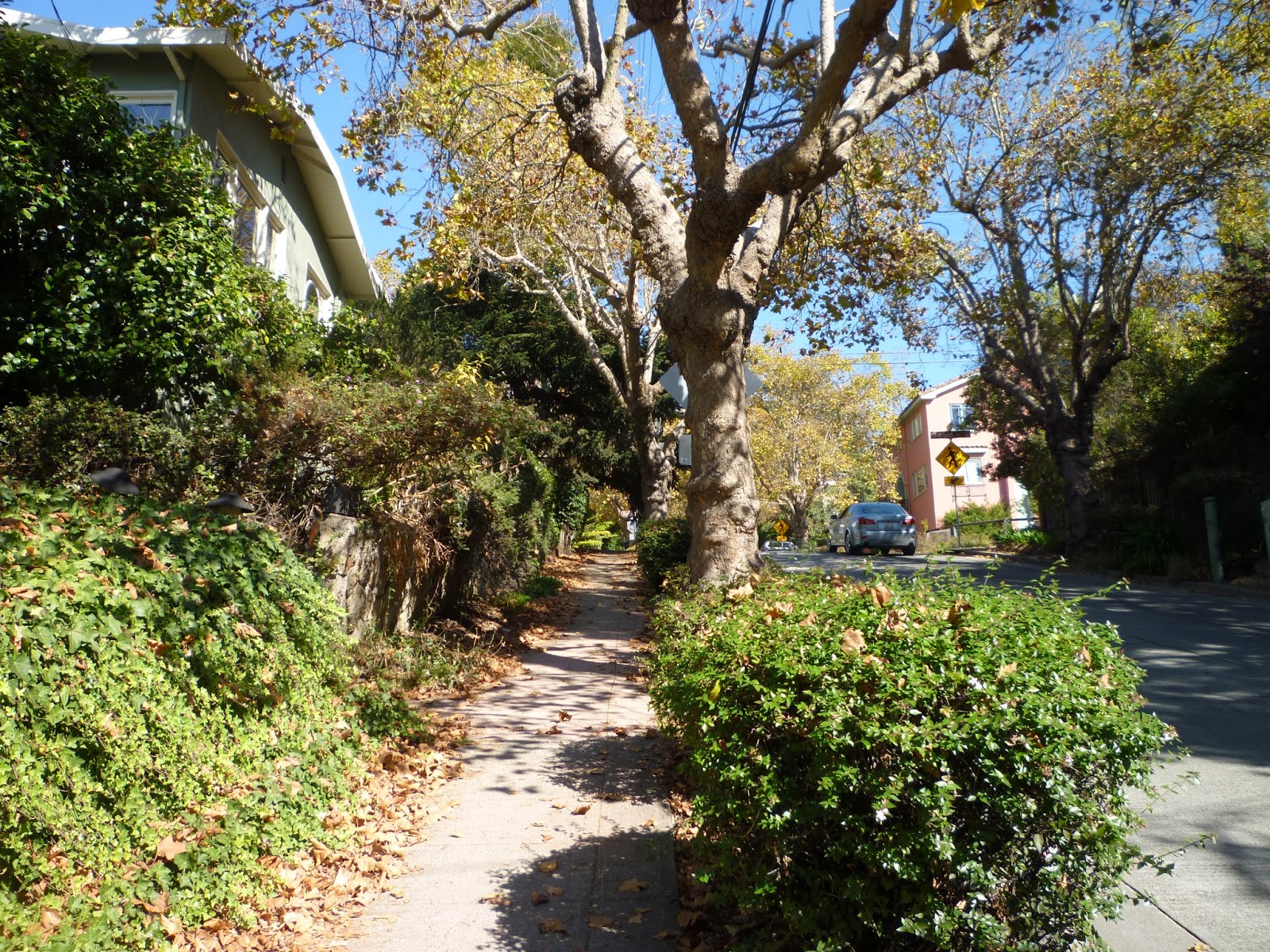 After lunch, because we wanted to return to the higher neighborhood, it was necessary to hike up, and this time we took the steep route of Marin Avenue. Again my experience seemed altogether different from that of years ago, when most evenings after dinner Grandma, at an age greater than any of us have reached yet, would lead us on brisk neighborhood walks. It was slower than then. And the crucial person was missing.