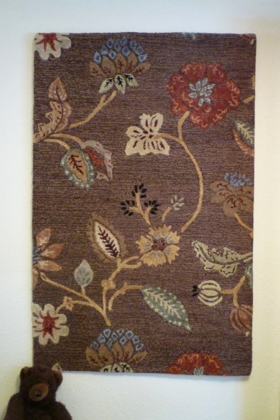 An expanse of wall that has been needing something for three years now has a rug to make the toy area of the living room more cozy. This is my view from the kitchen, of a wallscape that has warmed up considerably.