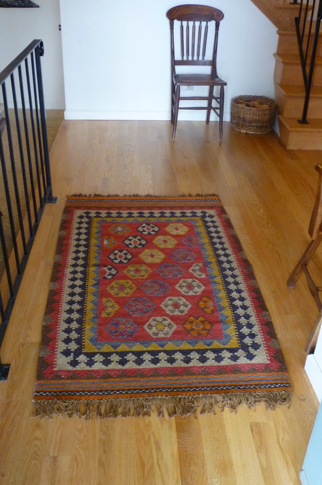 While I was rug shopping I decided to update and brighten up our entry with a new rug for the front door. I had to open the door to get enough light on my subject; that is a little piece of its blue exterior lower right.