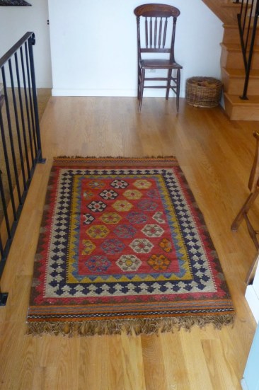 [Update: I didn’t stop thinking about it after all, but kept noticing how that chocolate brown runner was too dark a mass of color drawing unnecessary and conscious attention to itself, so I bought a red version and am happier now. This picture including the red-toned rug next to the wood stove shows how things have become more coordinated.]