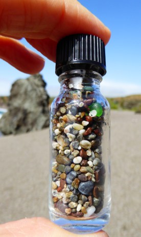Remember when last month I saw the sand display in Pacific Grove? Soon afterward I did buy some small bottles in hopes of filling them with sand from my explorations. I managed to have two with me, and I collected the first sample at this beach. It even contained a piece of beach glass.