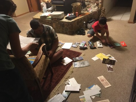 I had taken a big box of old maps up to the mountains with me, to offer to the family before I recycle them. Several people were curious, but Scout was most captivated by them and thrilled at the possibility of having some of them for his very own, now that he can read and decode them. His parents helped him sort them into categories, and eventually they let him take the whole box, to be more thoroughly sorted and culled later. He searched me out several times to thank me for the maps 🙂